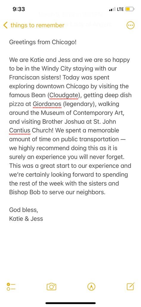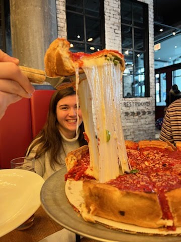 Today we got a taste for what the Chicago city life was all about from riding public transportation, visiting the Bean (a.k.a. Cloud Gate), and trying the iconic Chicago deep dish pizza. We started off our day with Mass at Holy Name Cathedral, which energized us for the day ahead. The cathedral was beautiful with the large stained glass windows and the tall marble pillars. After Mass, we walked to downtown Chicago and went to Potbelly Sandwich Shop, a well-known sandwich shop originating in Chicago, for a delicious lunch. We then walked to the Navy Pier where we got to see the vastness that is Lake Michigan. The cityscape could be seen on the shores of the lake and it was such a lovely sight. As we walked along the pier, we reflected on what our experience in the city was like so far and how drastically different it was from our small city of Helena, MT. After the pier, we made our way to the Bean, a famous art piece in the heart of Millennium Park. We found a lot of joy taking fun pictures with the Bean and taking pictures of each other. We ended the night with dinner at Giordano’s, a pizza parlor famous for its deep dish pizza. The pizza was amazing and the conversations we had with each other were even better. Throughout the day, we came across many of the homeless and it was kind of difficult, feeling like we couldn’t help them, but one of the least things we could do was acknowledge them as the beautiful human beings that they are. Reflecting on today, we’ve enjoyed immersing myself in the big city culture and lifestyle, but also seeing God through the faces we’ve seen, the conversations we’ve had, and the places we’ve been. After getting to know the city a little better and seeing God in the little things, we are charged up for the week of service ahead.