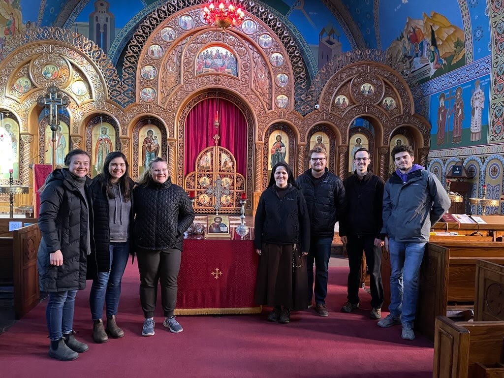 Today started out as most with mass at 6:30am and breakfast to follow. The Holy Cross seminarians and Franciscan sisters and brother all sat down to eat and share stories. I seem to learn something new from each person I encountered which is a beautiful thing. After clean up we all parted into our duties. Some went to the school to clean and others, like myself and Kenna, went to the basement of the convent to clean out the walk-in fridge. What seemed like a boring task turned into amazing conversations with sister Emily and lots of laughs along the way… btw don’t use baking soda to clean steel shelves. Sister Emily told us about her discernment and religious life, which was eye-opening to me as it was all very foreign to me before this trip. After lunch Riley, Ray, Kenna, Conner, Chris (one of the seminarians), Sister Kate, and I went to the Ukrainian village during our break time. We had originally planned to see the Ukrainian Catholic churches nearby. When we got there we were met with locked doors. We went to the Ukrainian museum next door for any sign of help to let us in and we were met with such a loving, welcoming, compassionate presence. The women working there showed us around their museum which was filled with art, culture, and history. Maria, a Ukrainian woman working at the embassy, then kindly walked us over to let us into the church. The church was beyond beautiful. While I’m the Church, Maria described the history of the Ukrainian church in the United States and then we had a moment of silent prayer for peace in Ukraine. One thing she said stood out in particular: Maria then even offered to walk us to the Ukrainian cathedral which is a few blocks away. This was also beyond anything I have ever seen. It was incredibly humbling to pray in a place filled with so much history, culture, and love. The presence of the Lord was so tangible in the Ukrainians we met and the God was clearly in those spaces blessing every single person.