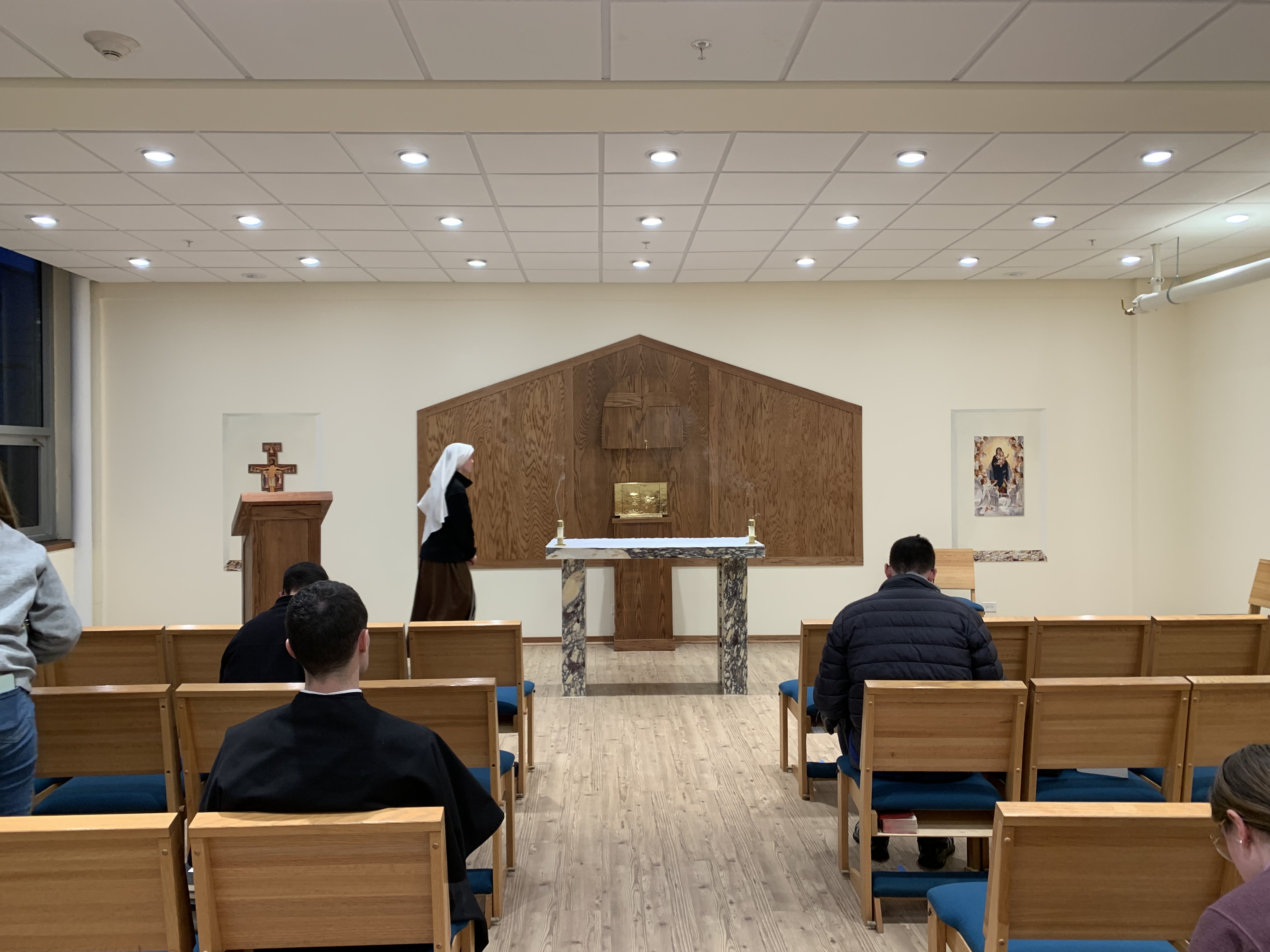 We then headed up to the lounge and heard from Sister Jaime, Sister Maci, and Alex (a Holy Cross seminarian). It was such a gift to hear their stories of intentional listening to the Lord’s call in their life.