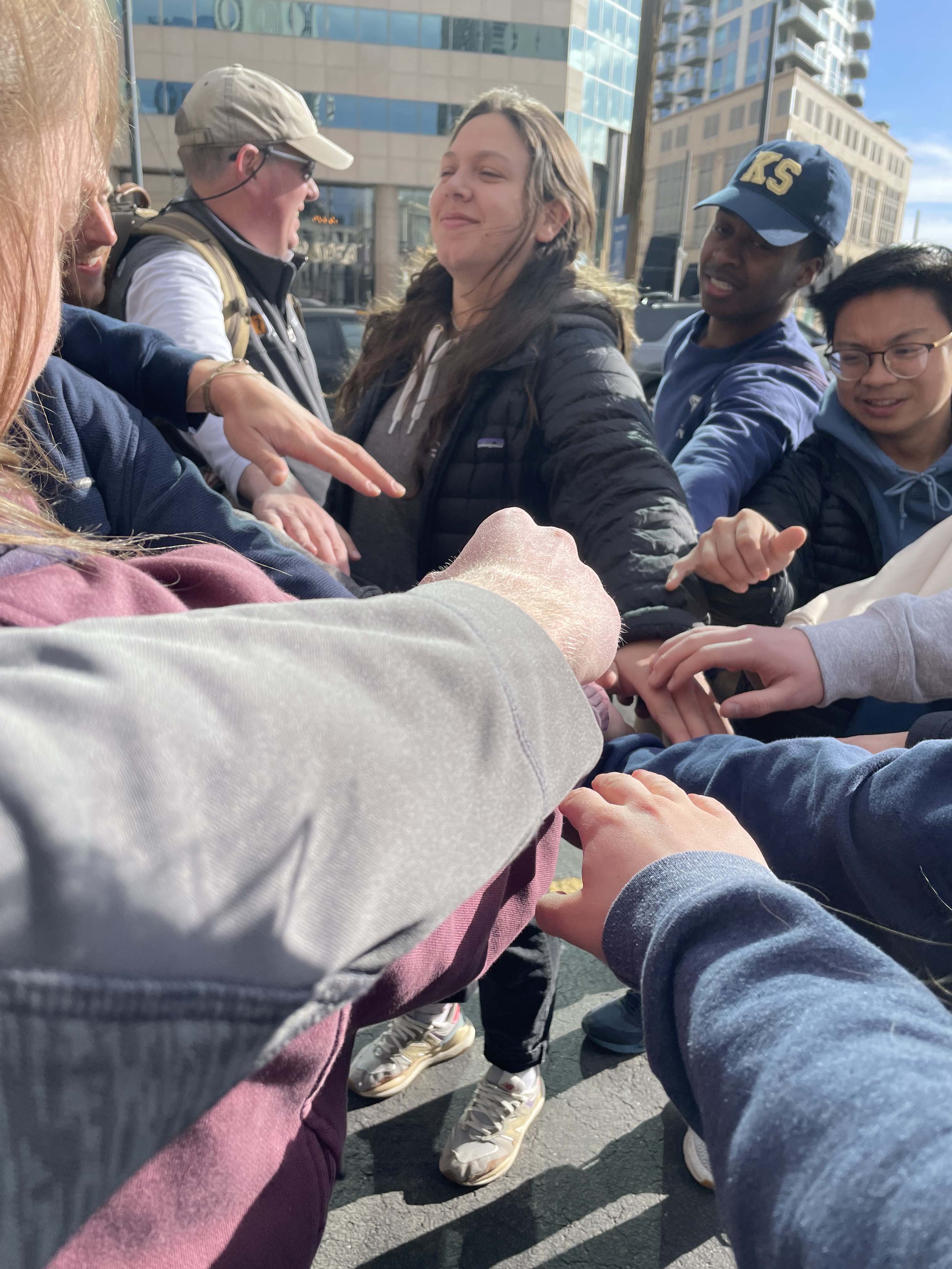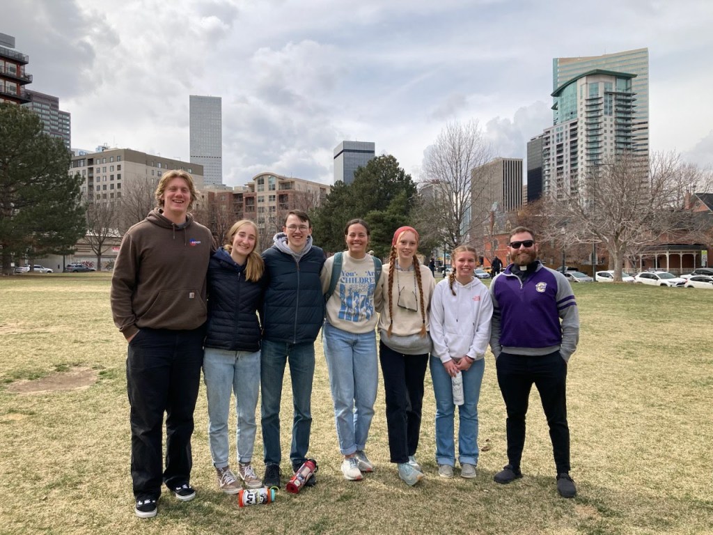 Hi all, Tess reporting for duty here! Today started off bright and early with morning prayer at 6:30 in Our Lady of Guadalupe Church. After breakfast and a few house chores, we were off to the streets to meet the homeless of Denver, the many friends of Christ in the City. My team walked 20th street and met Marcus, a man with a passion and talent for sketching, and especially portraits. Our team missionary, Olivia, brought him some chalk, which he was happy to accept- we learned that chalk is his favorite medium! (Seen in the picture sketching a chalk portrait of Mason, one of the Kansas seminarians).