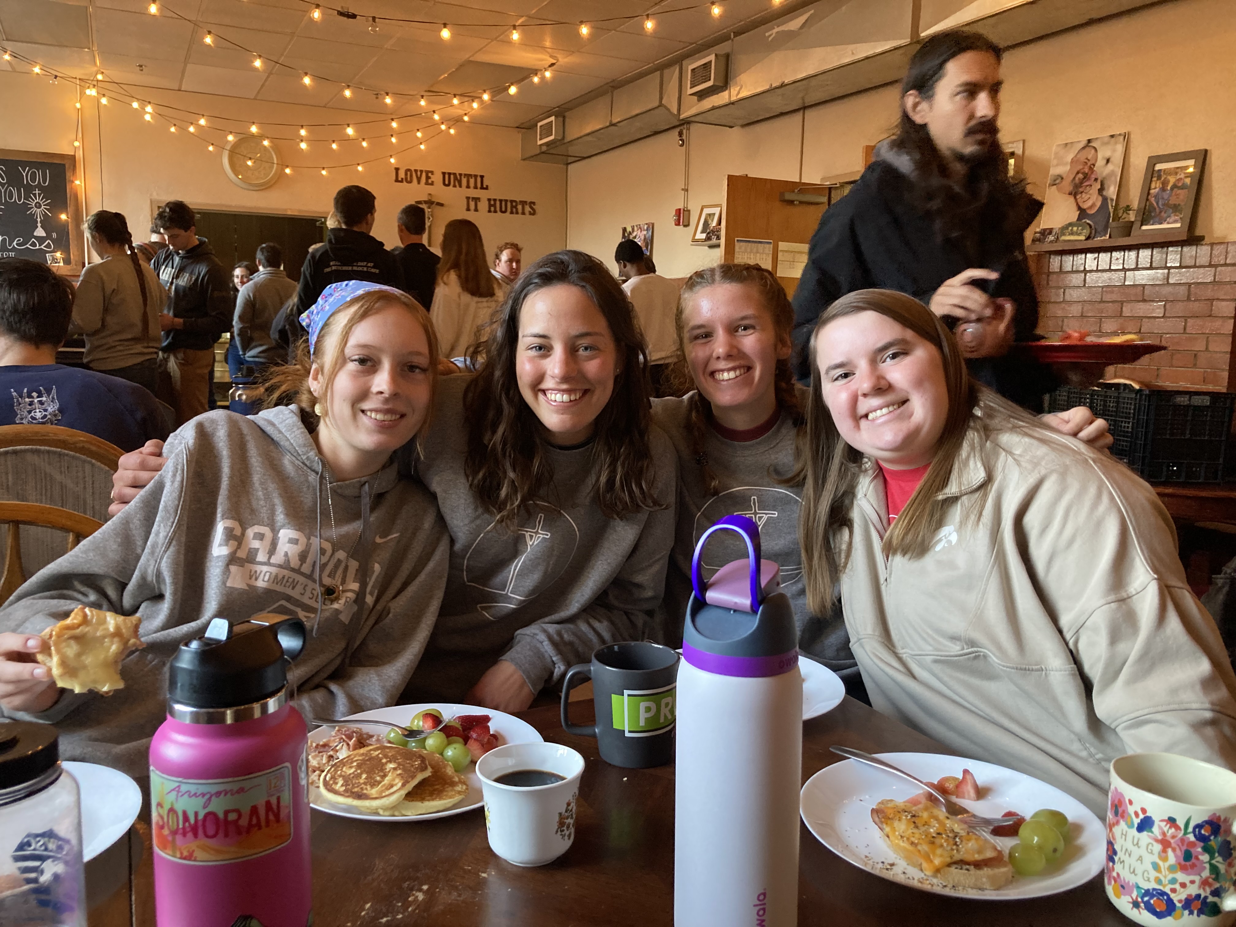 Hello readers! Today we started off with the same routine of waking to blinding lights at 6am and walking down to the Our Lady of Guadalupe Parish to pray morning prayer. We stayed there afterwards to say mass, which featured a beautiful homily by Fr. Drew Hoffman about how the Lord will not forget us. After this we came back to do some personal prayer, while the cooking crew whipped up a delicious meal that included pancakes!, oatmeal, fruit, and ham and cheese sliders. We ended the morning with an amazing talk on poverty given by one of the CIC missionaries, Lidia. She talked about surrendering the material things we grasped as well as the spiritual things we grasped(like our sins, self-consciousness, anxieties, etc) in order to receive the gift of poverty.